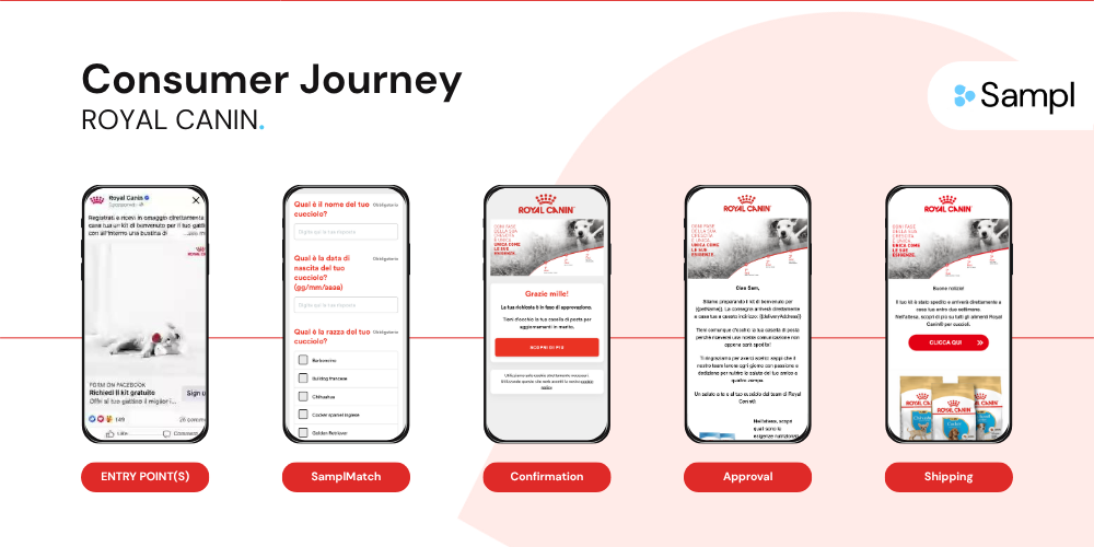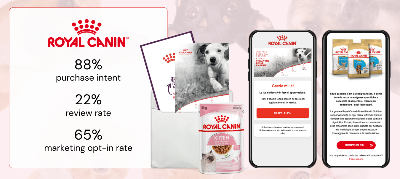 Through SamplMatch, our proprietary qualification and targeting engine, Royal Canin reached 30,000 new pet owners across Italy with tailored trial kits. Each kit included personalised messaging, tracking, and a redeemable voucher that allowed Royal Canin to close the loop from trial to purchase.
